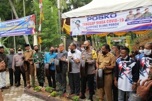 Unsur yang dijadikan instrumen penilaian Kampung tangguh diantaranya adalah kesiapan unsur petugas terkait penanganan Covid-19 di Gampong. Selain itu, unsur ketahanan pangan di Gampong, yaitu ketersediaan lahan untuk ditanami bahan makanan yang dibutuhkan masyarakat ketika terjadi pandemi di satu Gampong. Gampong Blang Poroh, Kecamatan Muara Dua dijadikan Gampong percontohan/pilot project bagi Gampong lain dalam wilayah Kota Lhokseumawe, yang juga merupakan upaya untuk selalu meningkatkan kewaspadaan terhadap wabah atau pandemi pada suatu Gampong. Hal ini disampaikan Kapolres Lhokseumawe yang turut didampingi Walikota dan Wakil Walikota serta unsur Forkopimda Kota Lhokseumawe.